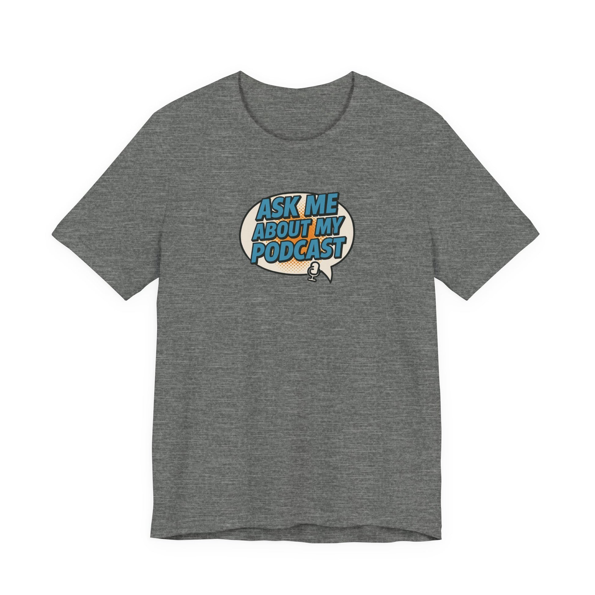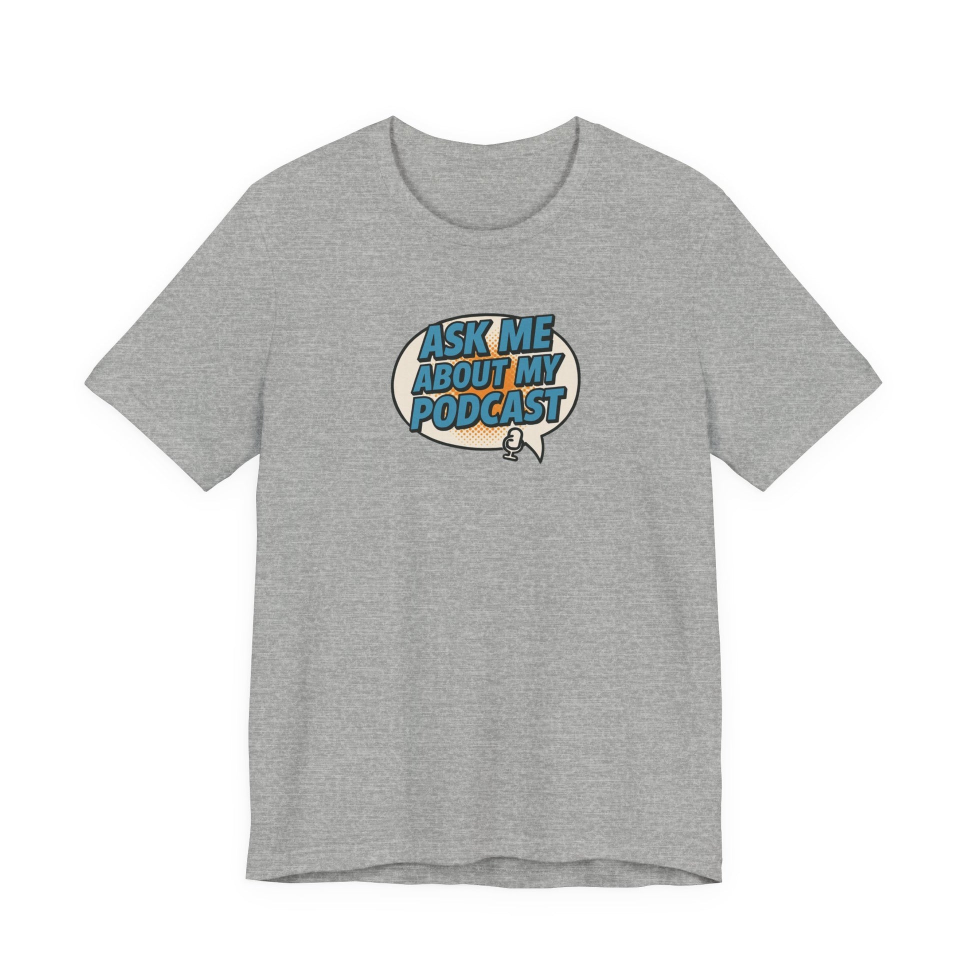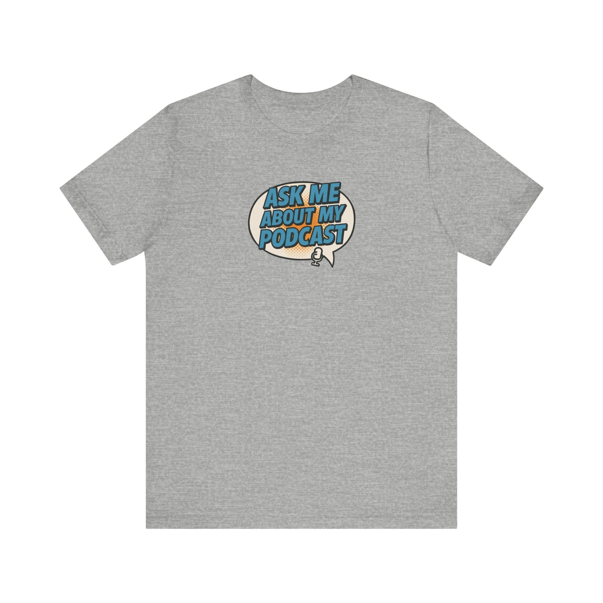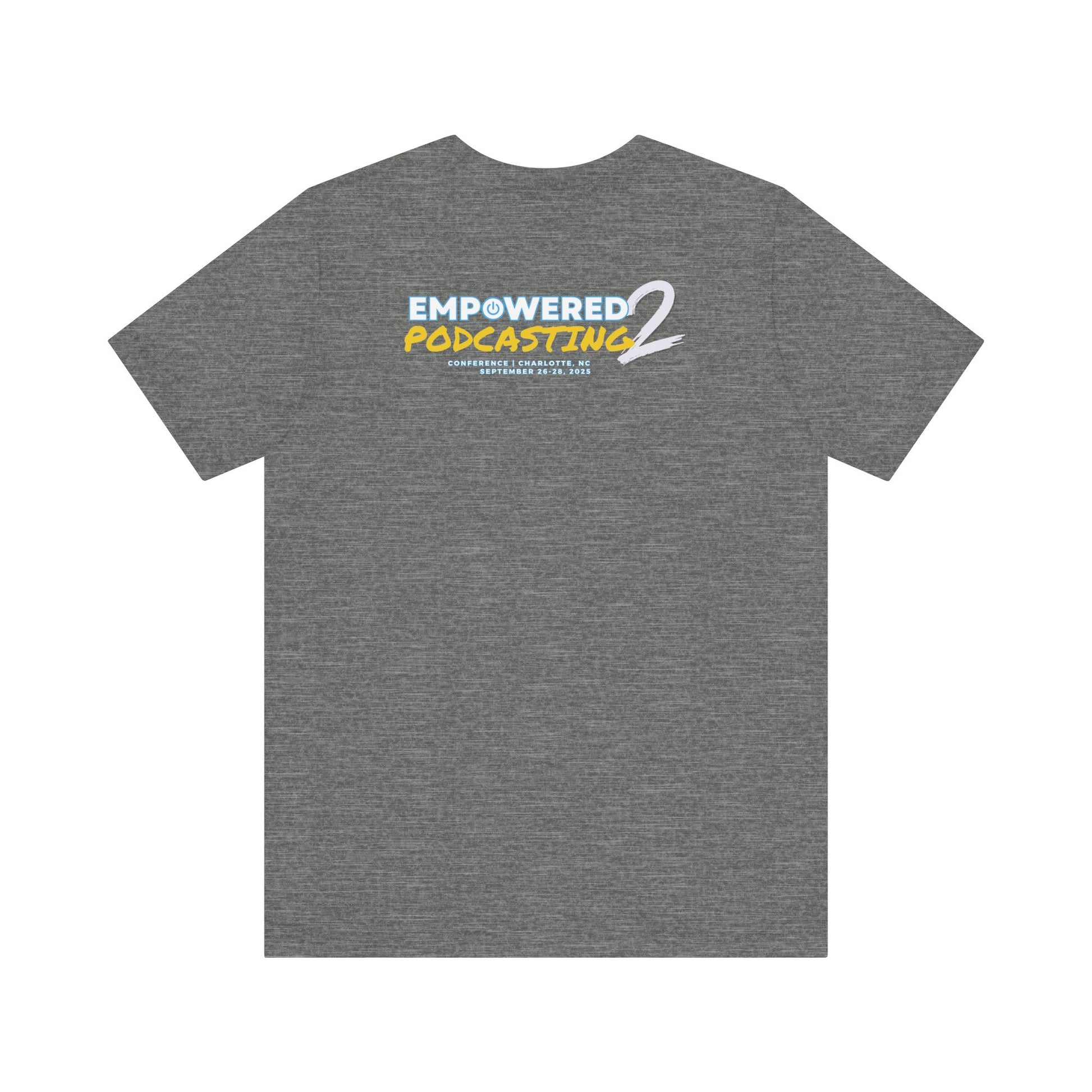 This bold comic book-style tee features a vibrant speech bubble design with the phrase “Ask Me About My Podcast” in eye-catching Carolina blue. With vintage halftone textures and a fun mic icon, it’s the perfect conversation starter for podcasters who want to stand out. The Empowered Podcasting Conference logo appears on the back as a nod to the community that empowers creators to share their voice. Modern, playful, and made for creators.