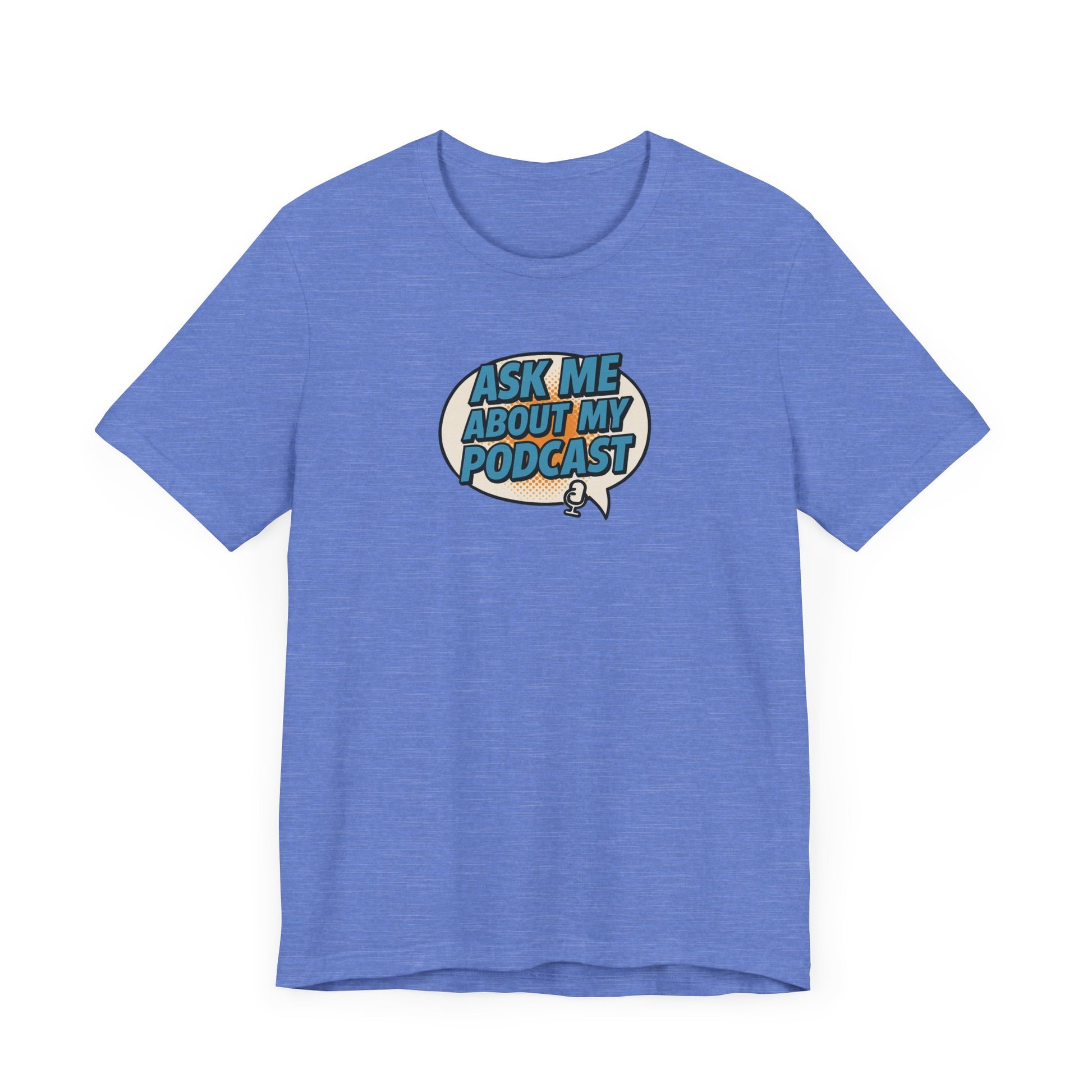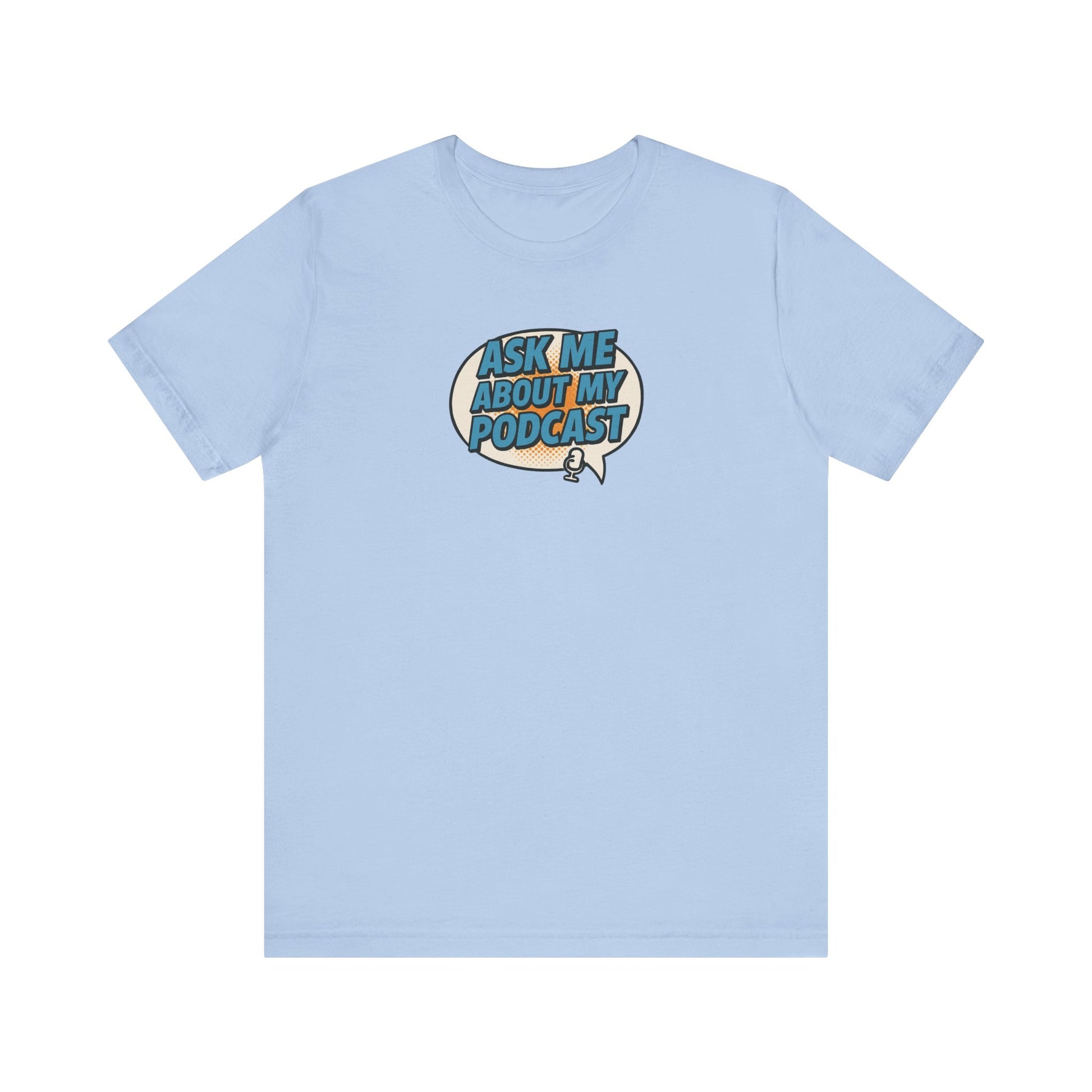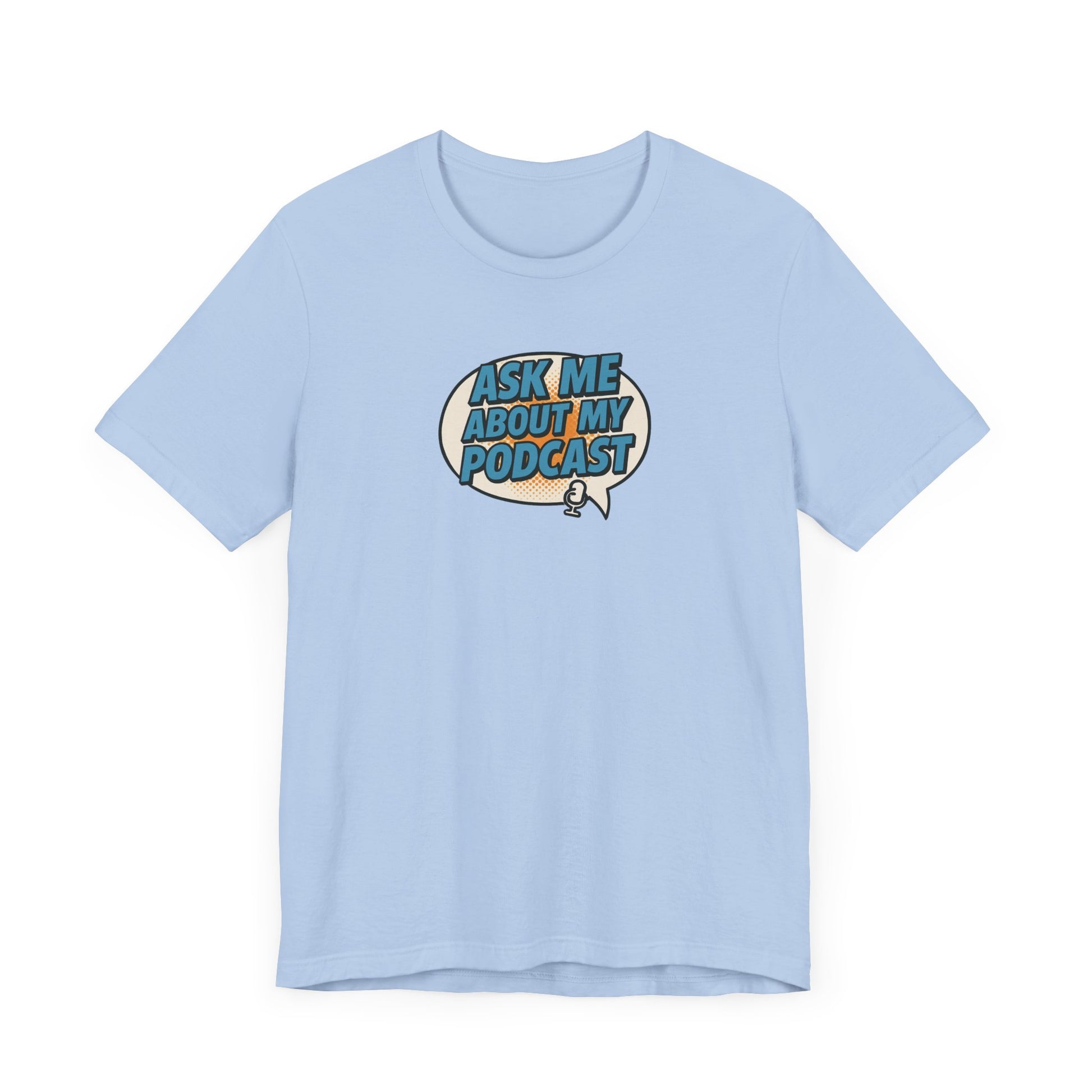 This bold comic book-style tee features a vibrant speech bubble design with the phrase “Ask Me About My Podcast” in eye-catching Carolina blue. With vintage halftone textures and a fun mic icon, it’s the perfect conversation starter for podcasters who want to stand out. Modern, playful, and made for creators. This soft cotton t-shirts have-ribbed knit collars to bolster shaping. The shoulders have taping for better fit over time. Dual side seams hold the garment's shape for longer.