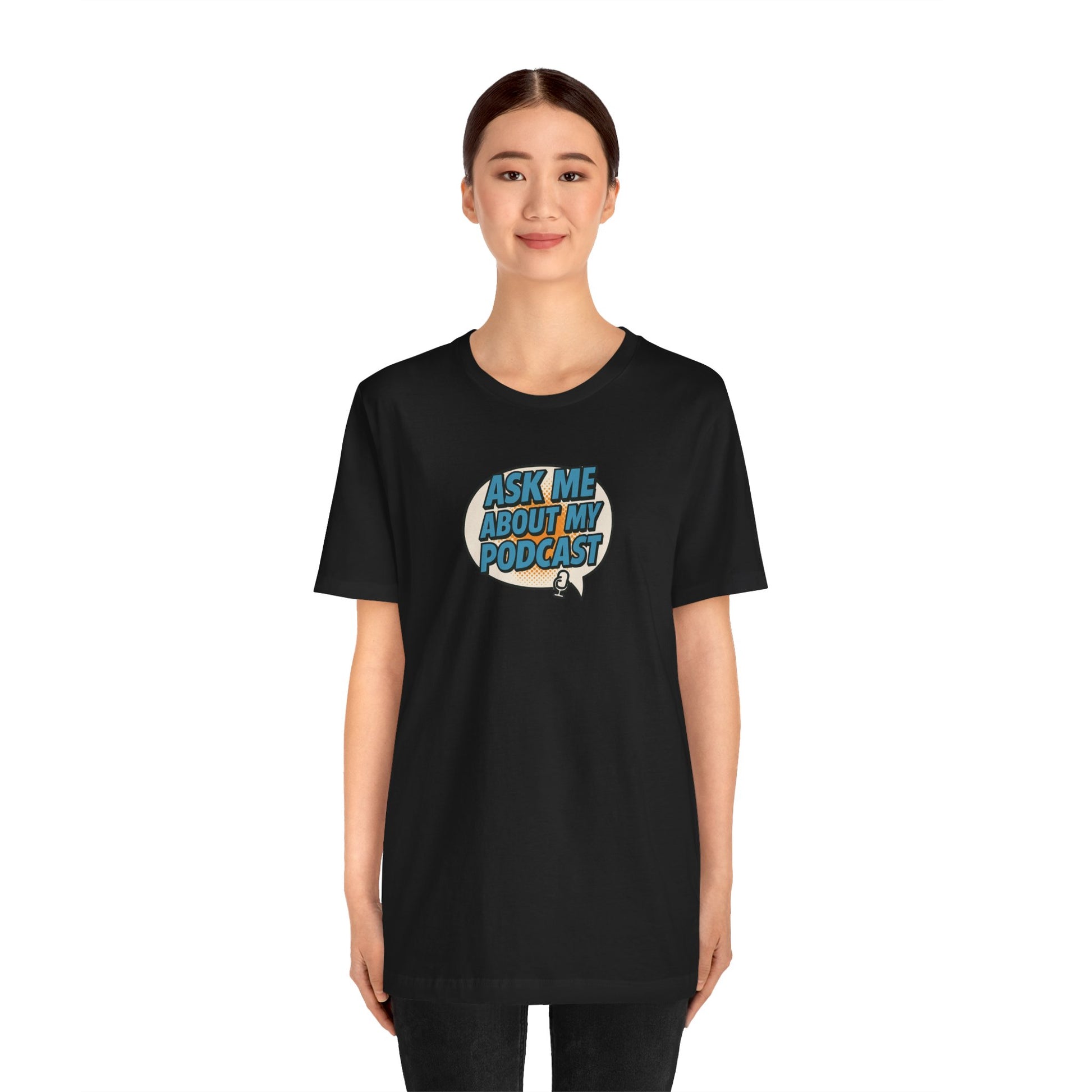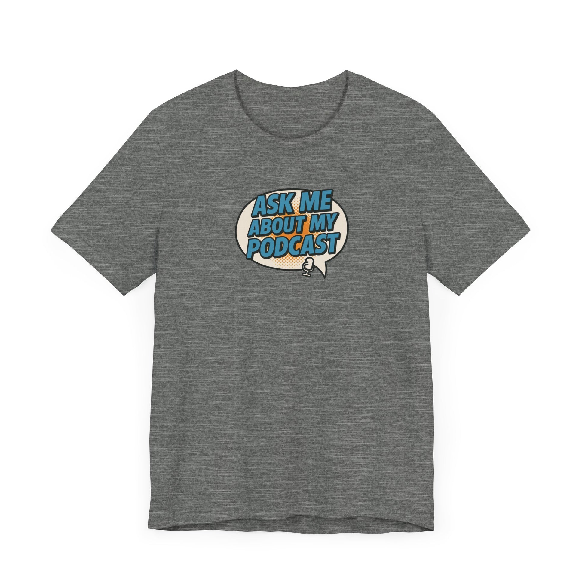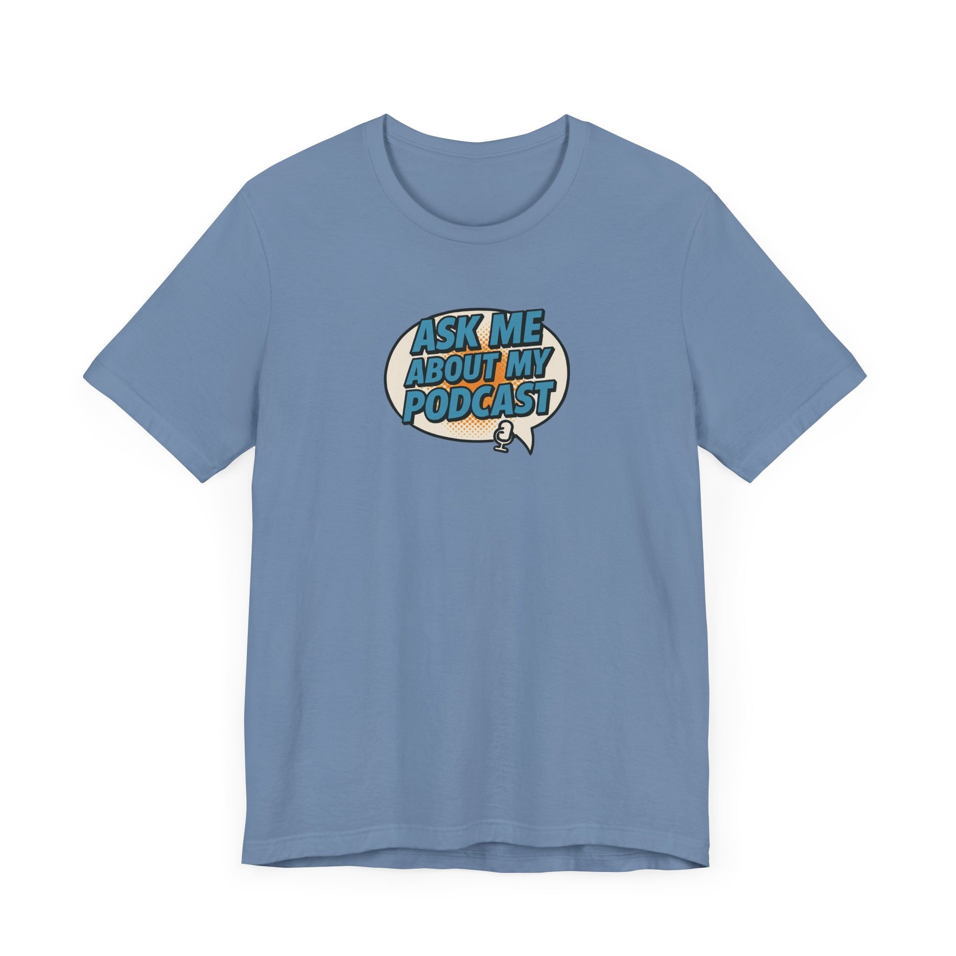 This bold comic book-style tee features a vibrant speech bubble design with the phrase “Ask Me About My Podcast” in eye-catching Carolina blue. With vintage halftone textures and a fun mic icon, it’s the perfect conversation starter for podcasters who want to stand out. Modern, playful, and made for creators. This soft cotton t-shirts have-ribbed knit collars to bolster shaping. The shoulders have taping for better fit over time. Dual side seams hold the garment's shape for longer.